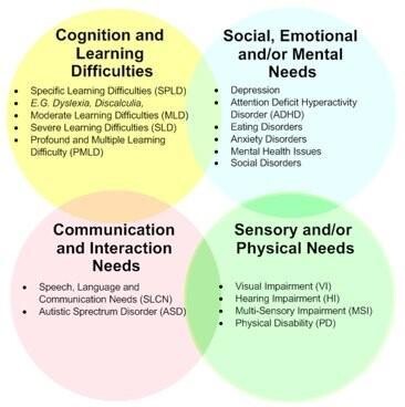 SEND or Special Educational Needs and Disability is when pupils may need additional or different provision to enable them to achieve their potential and is divided into 4 categories that a child will fall into. Areas of Special Educational Need include: